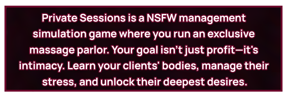 Private Sessions is a labor of love from a solo indie developer. To bring this project to life within a reasonable timeframe, Artificial Intelligence tools were utilized to assist with coding, game planning, and artwork generation. My goal is to deliver a fun and complete experience, and I appreciate your support for small creators!